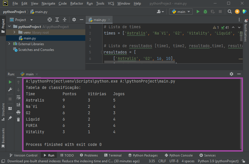print(f"{'Time':<15} {'Pontos':<10} {'Vitórias':<10} {'Jogos':<10}")