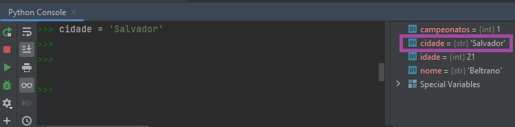 cidade agora mostra o valor Salvador no PyCharm.Quer testar outras variáveis? Teste algumas (ou todas) no PyCharm:
